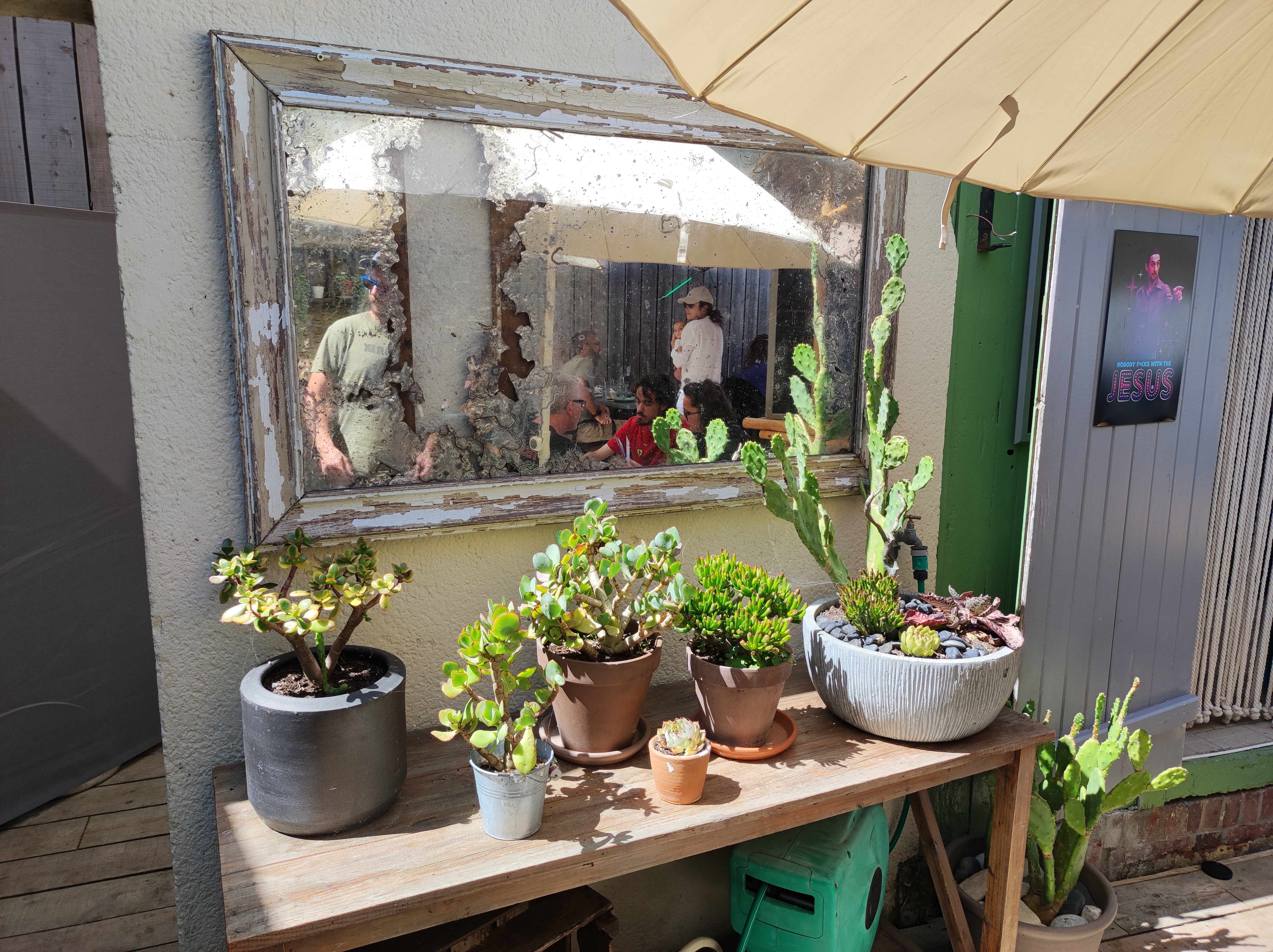 Terrasse extérieure joliment aménagée. Bon vin et repas savoureux. Recommandé.